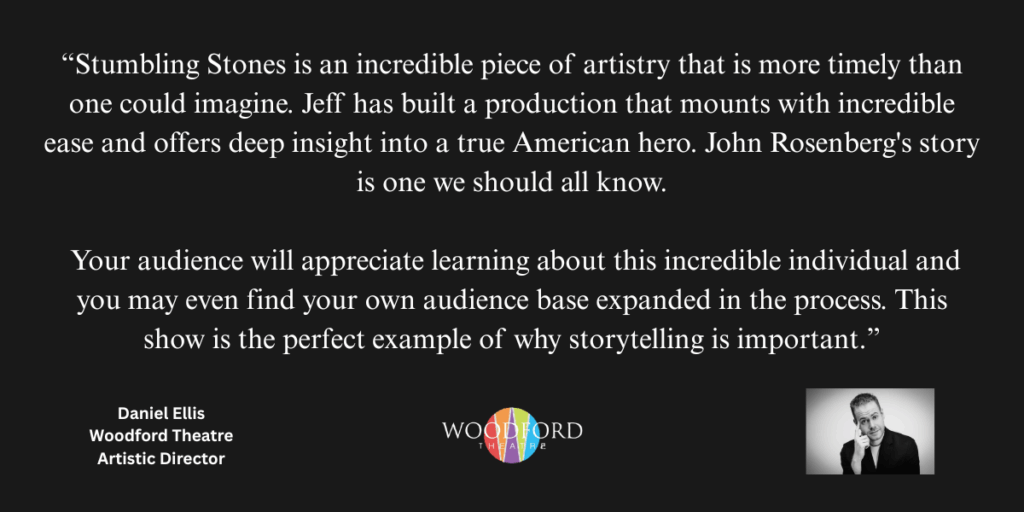 I wasn’t quite sure how a one person play could possibly betray the life of such a remarkable human man in 80 minutes! Needless to say, Jeff Sherr was remarkable in doing just that. It was the most realistic, heartfelt and captivating presentation that you will definitely realize that the hero that is living among us in indeed John Rosenberg.